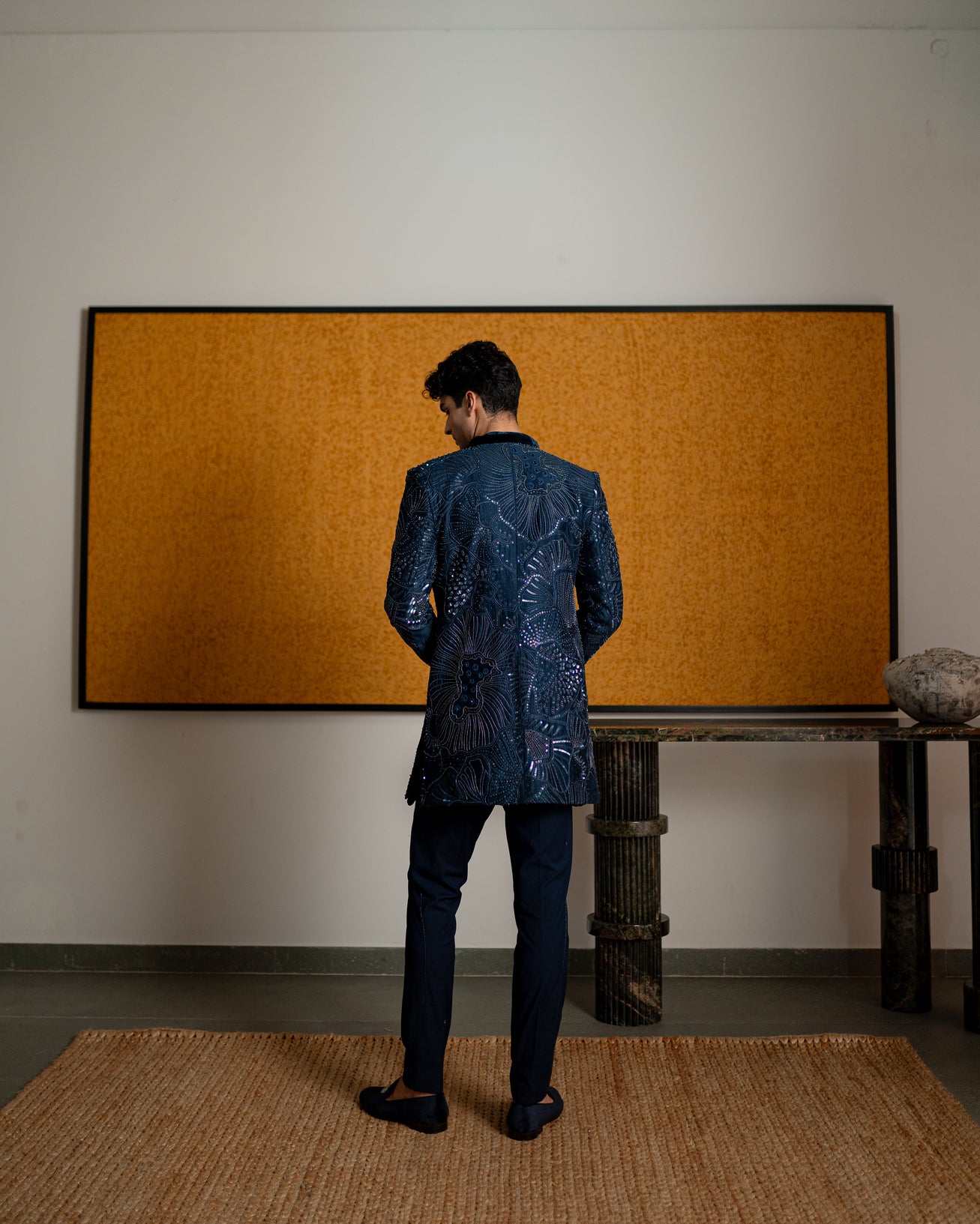SEA-CORAL TONAL EMBROIDERED SHERWANI WITH VELVET STRIPES KURTA AND PANT