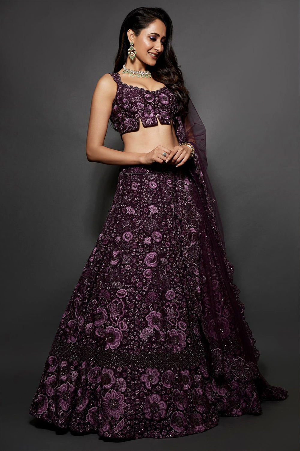 Purple organza lehenga with floral embroidery teamed with corset blouse with scallop detail and cutwork organza dupatta