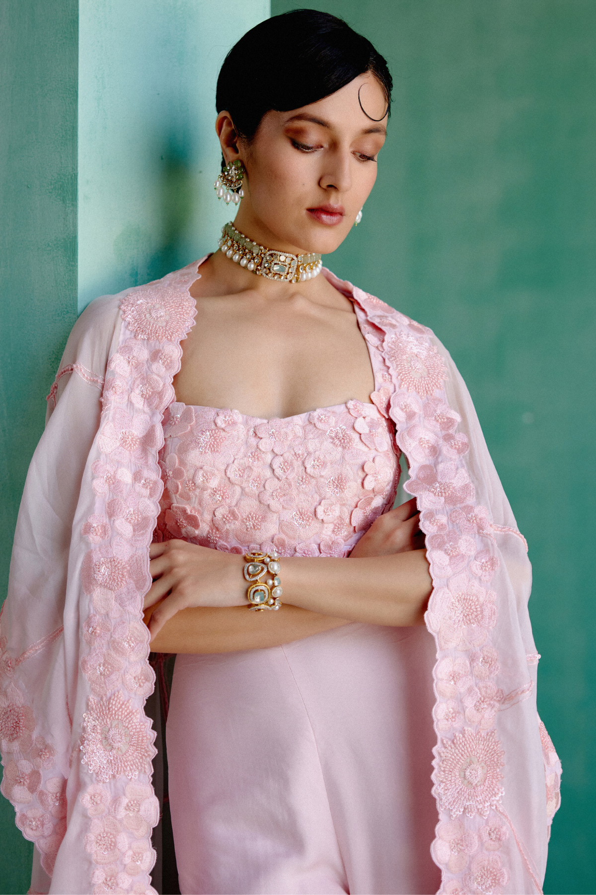Flared out floral bunches cape paired with embroidered bustier and plain pants