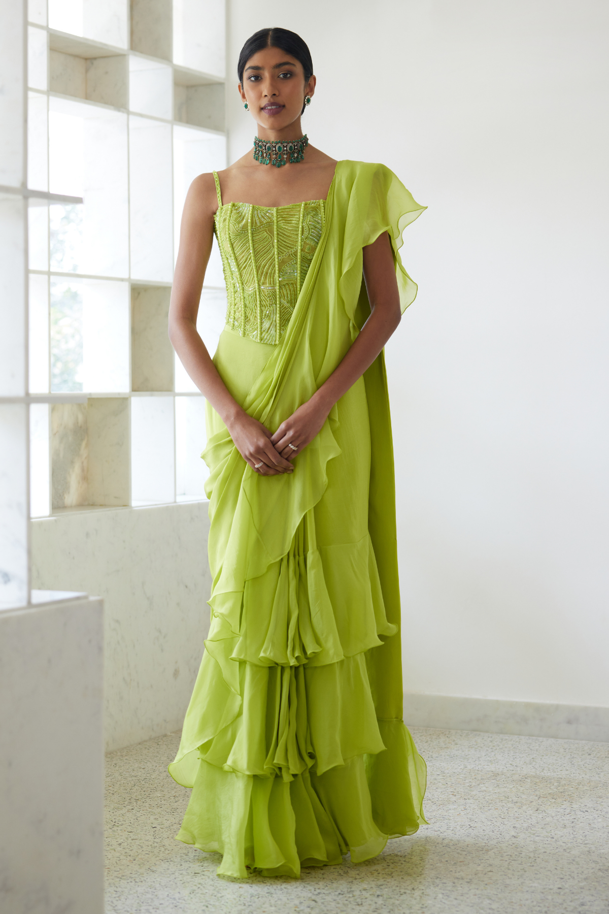 Ruffle saree paired with sea coral corset