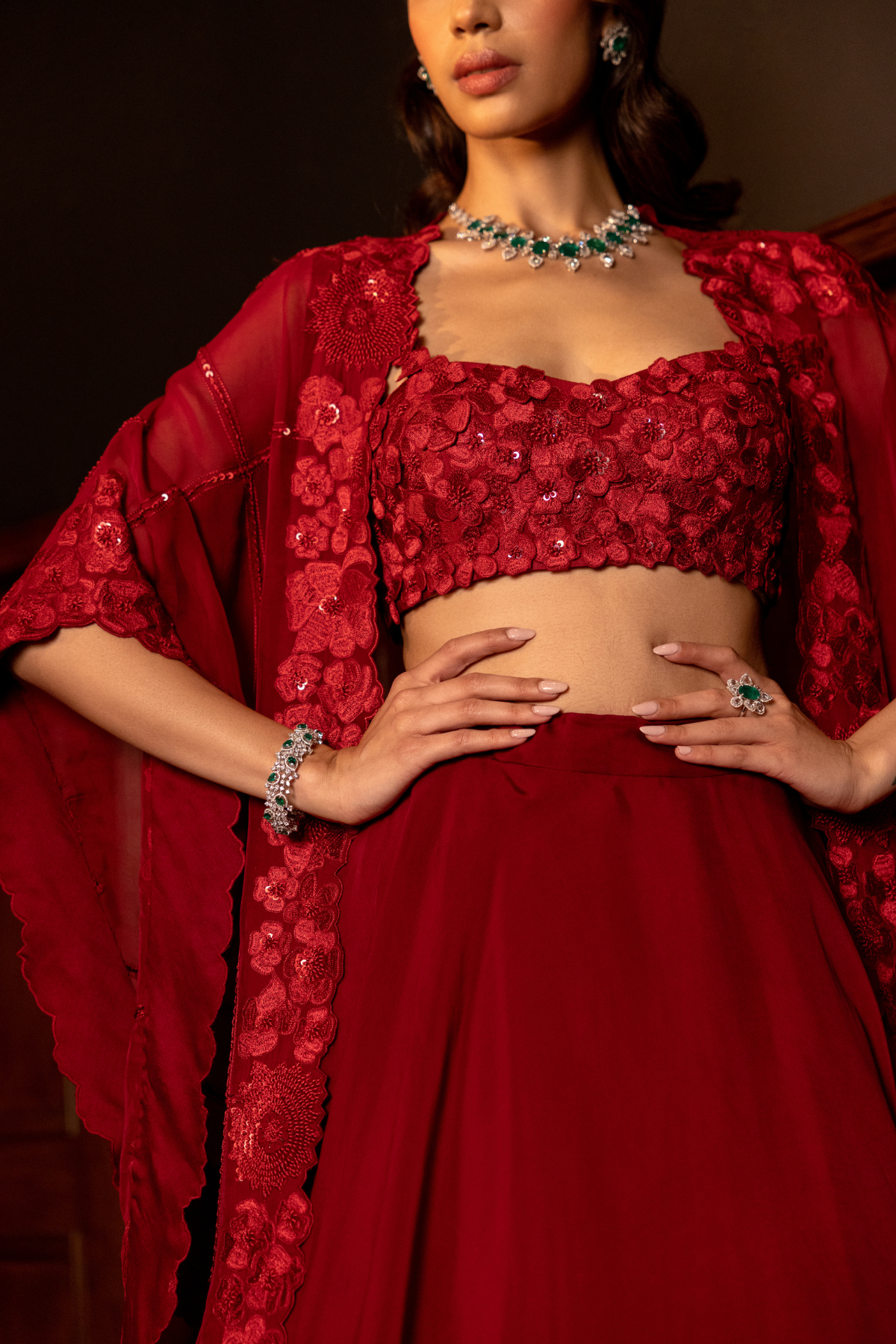 - Cape: Organza, Skirt: Organza, Bustier: Chanderi