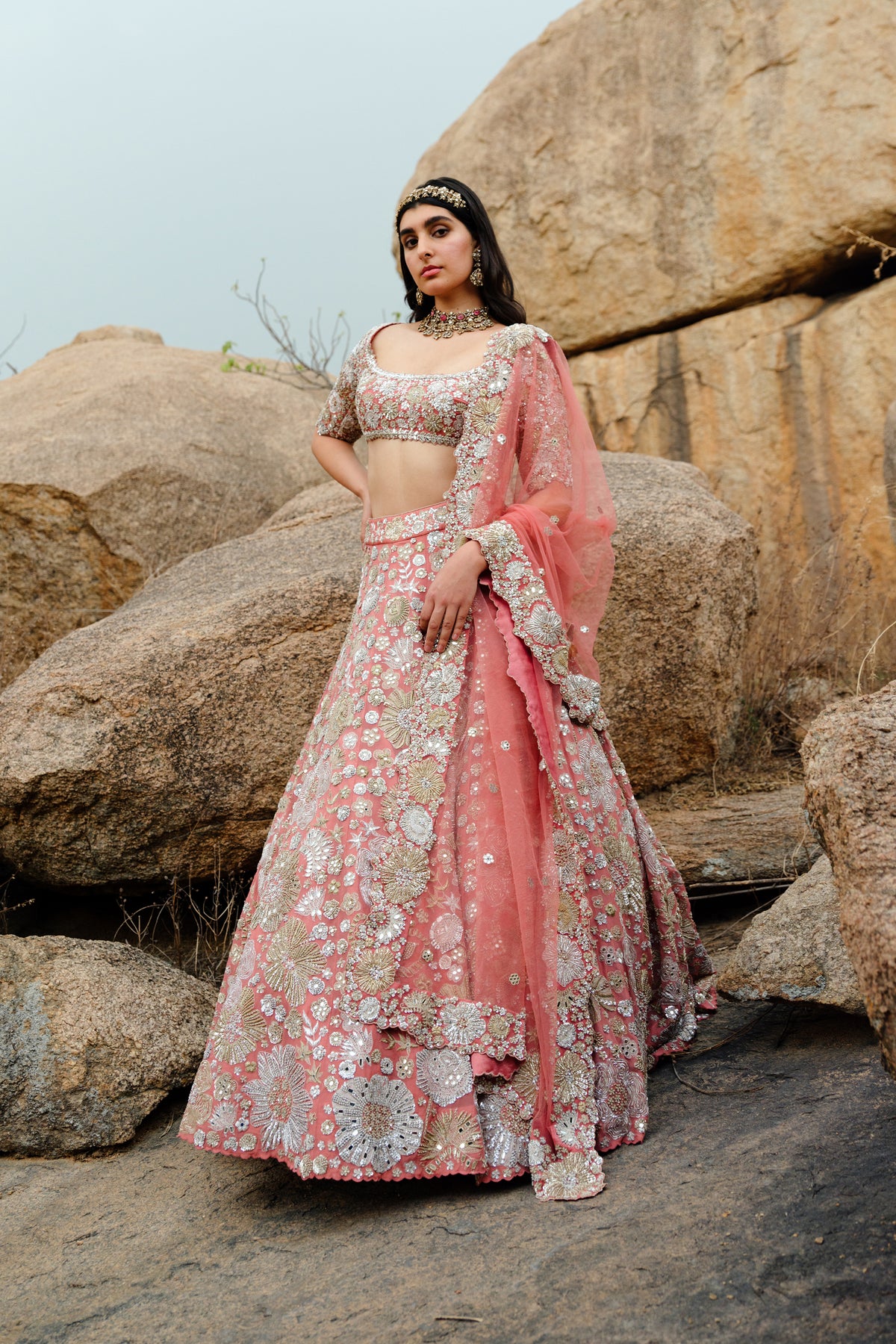 Rust pink gold and silver floral embroidered lehenga set