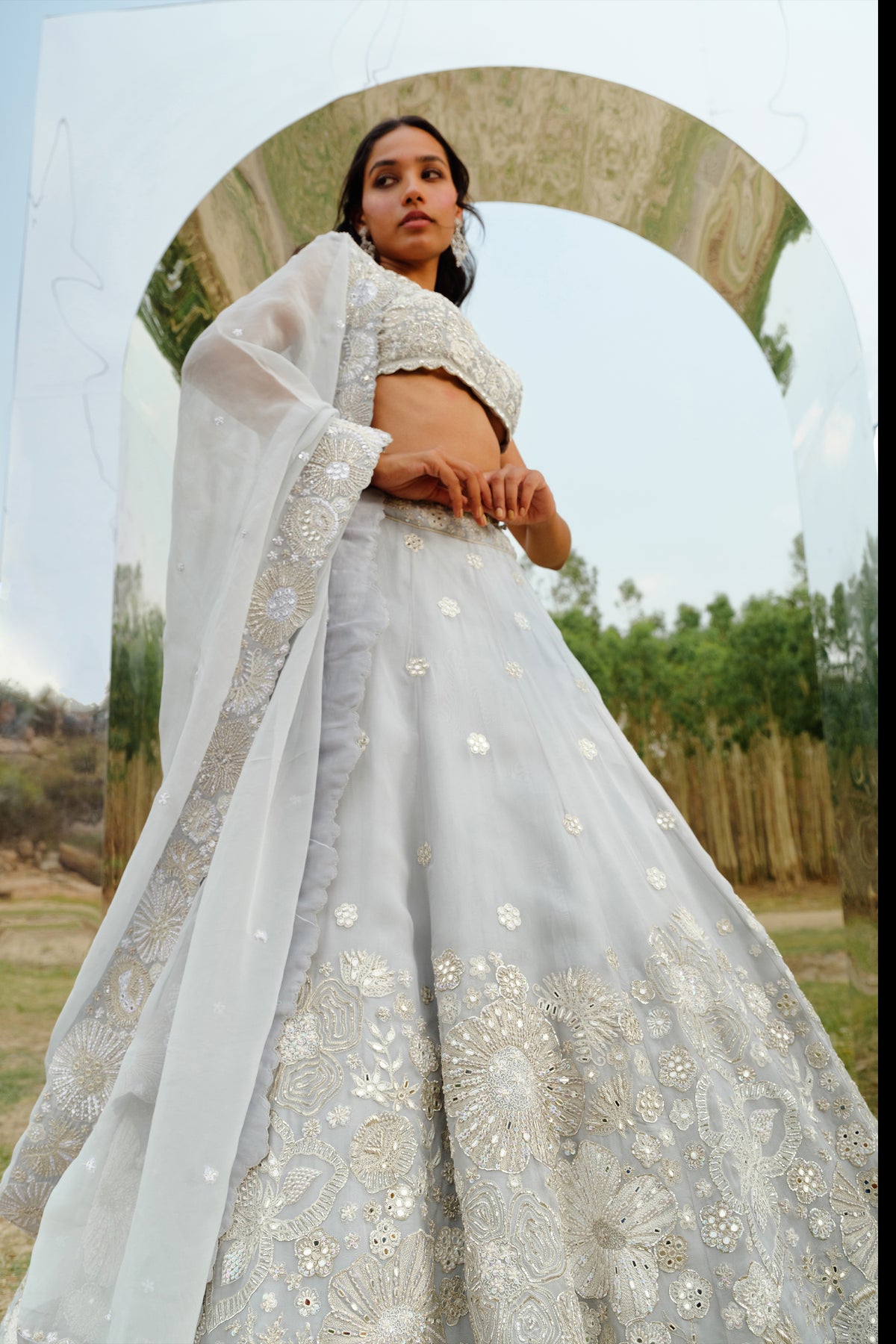 Cloudy blue silver embroidered lehenga paired with encrusted blouse and dupatta