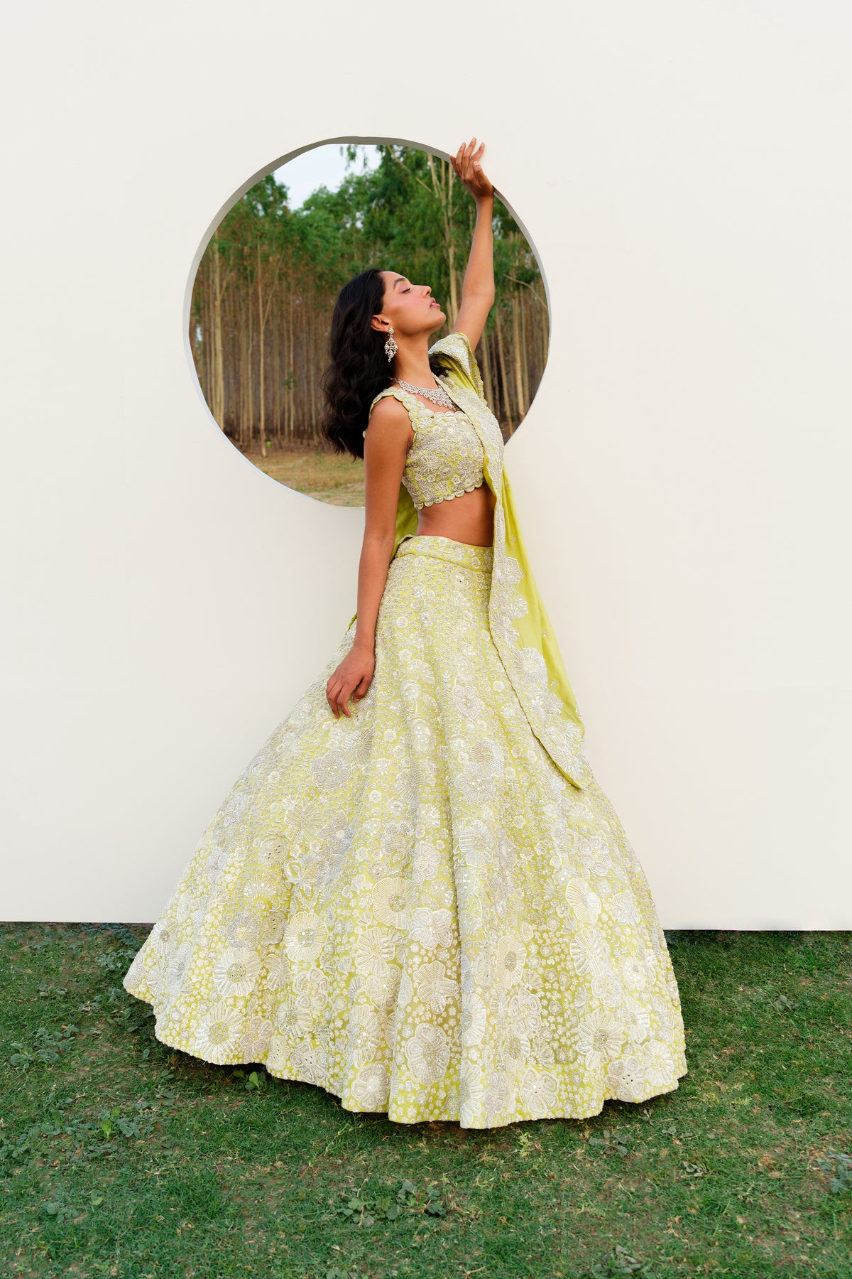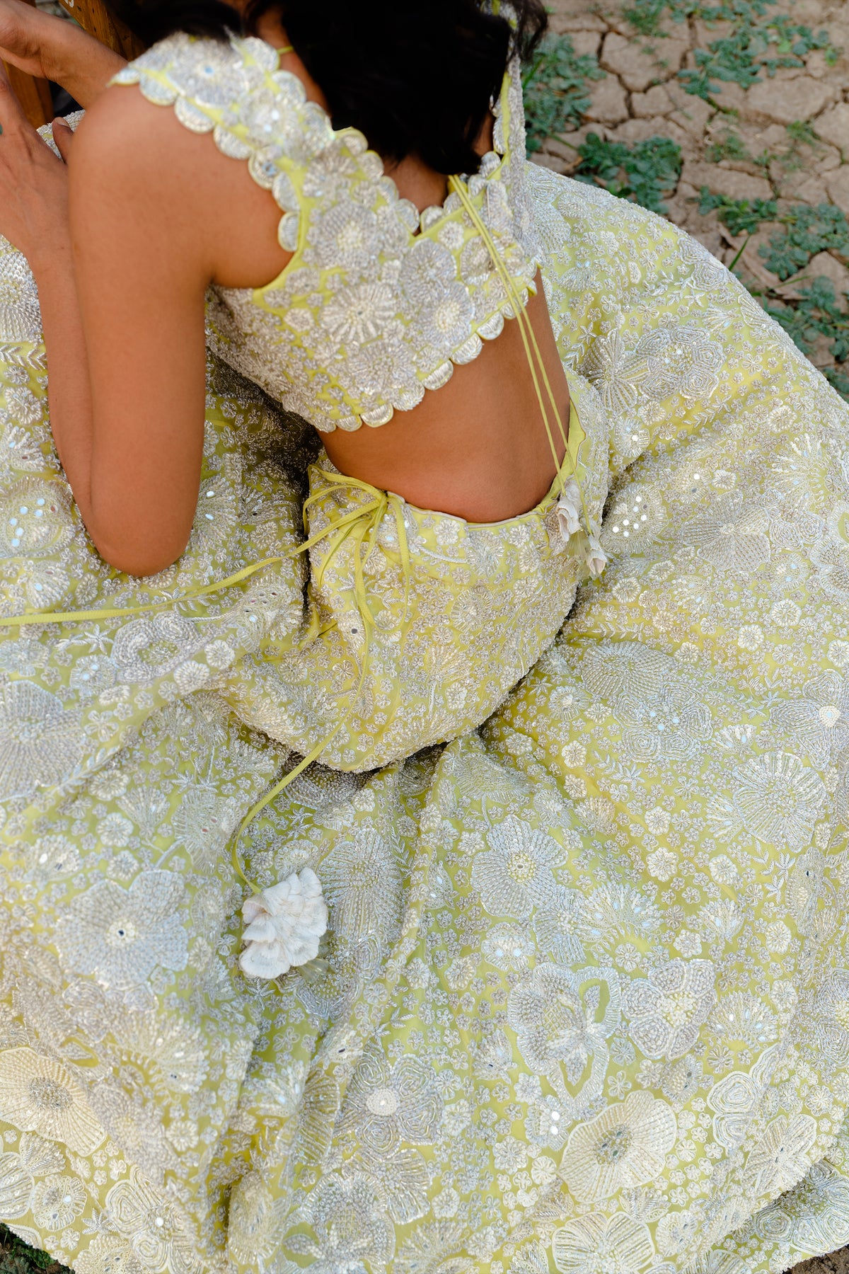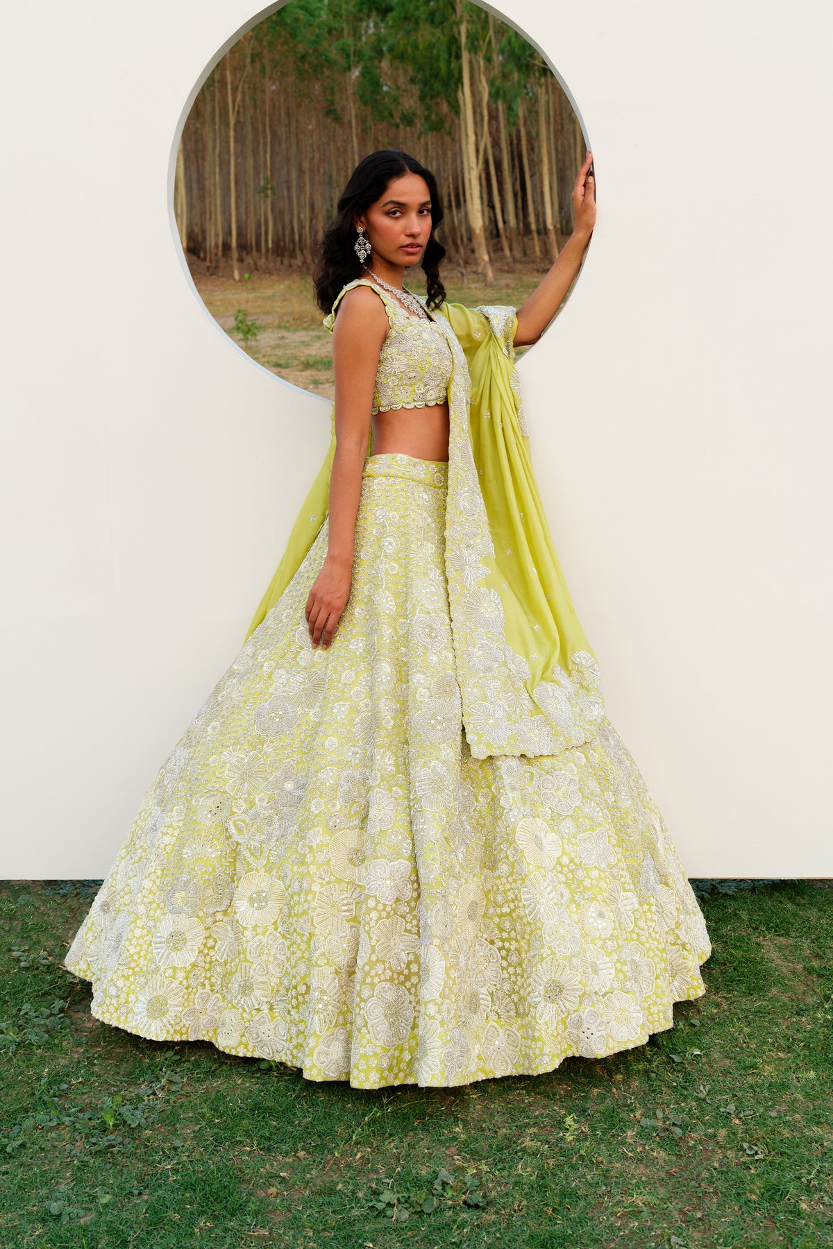 Green gradient embroidered lehenga with front open blouse with scallop detailing and heavy cut work dupatta