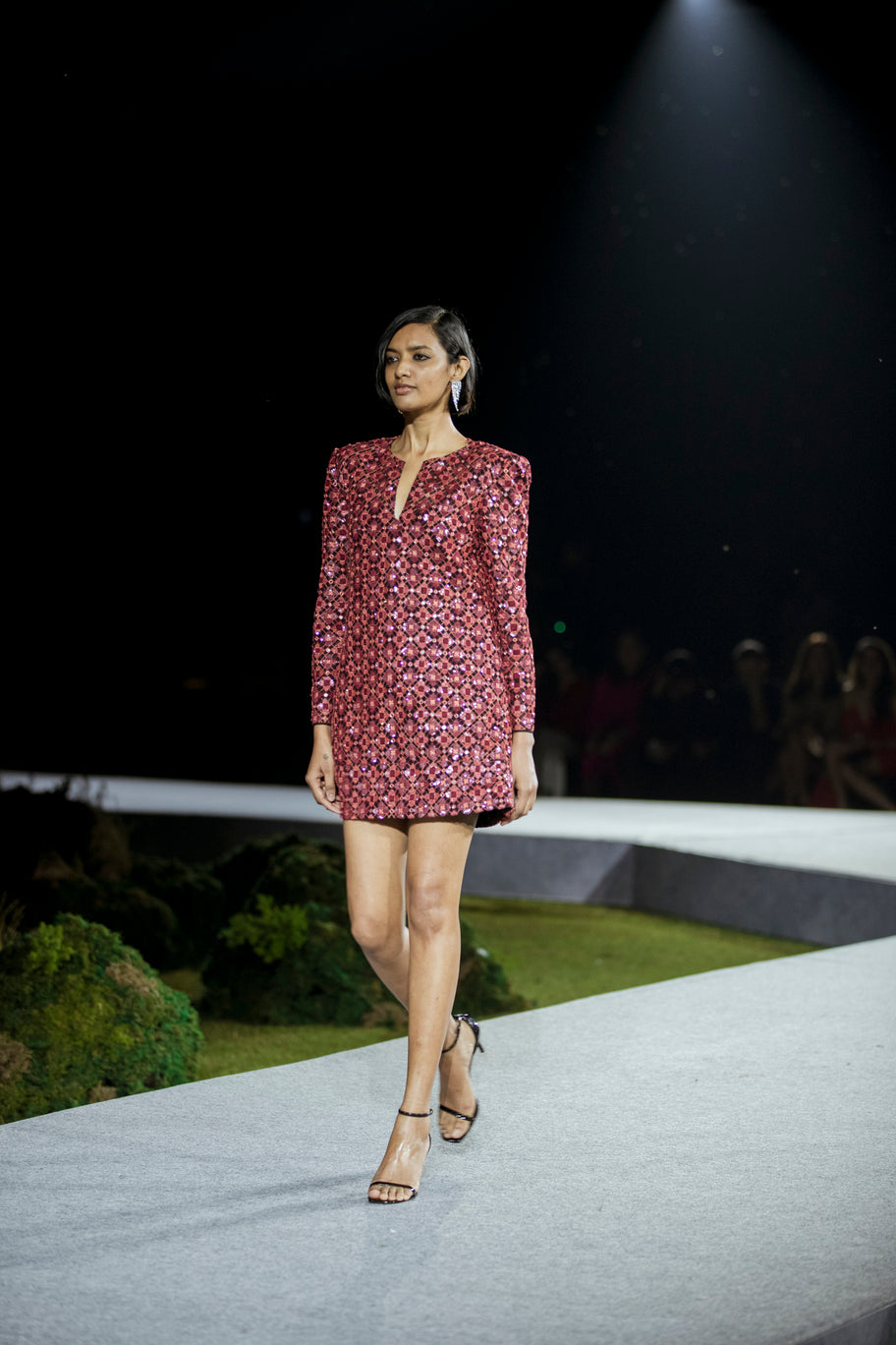 BOXY DRESS WITH GEOMETRIC GRID EMBROIDERY