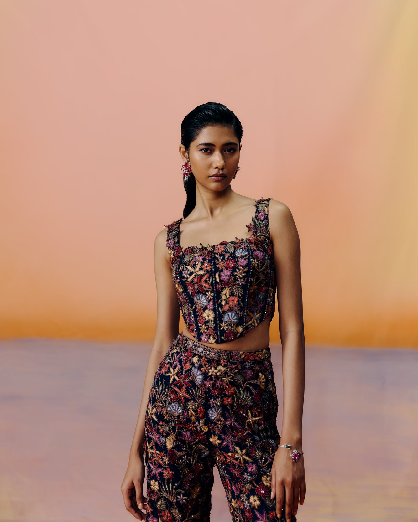 MULTICOLOUR WILDFLOWER CORSET WITH MULTICOLOUR SPACED OUT WILDFLOWER PANTS AND DUPATTA