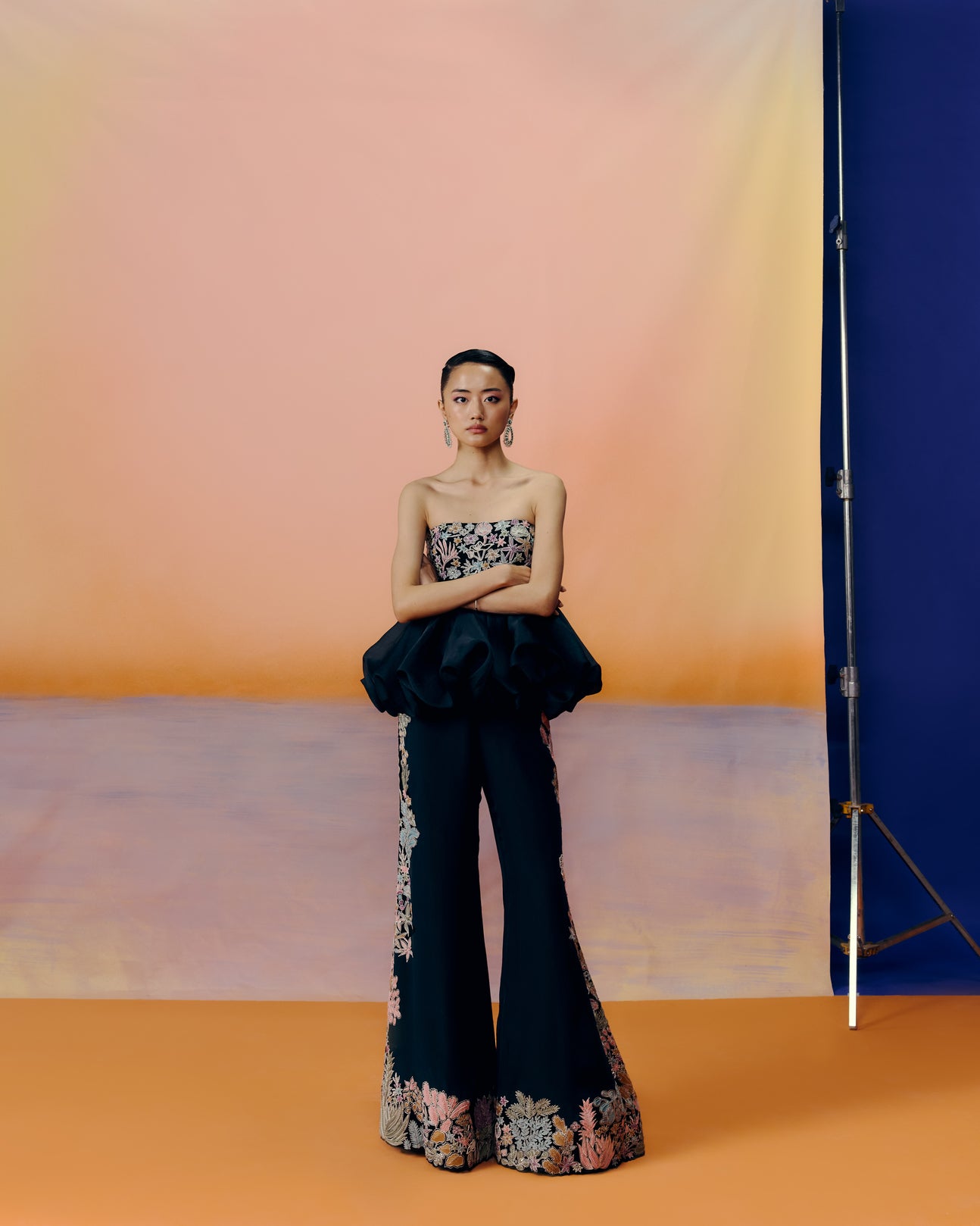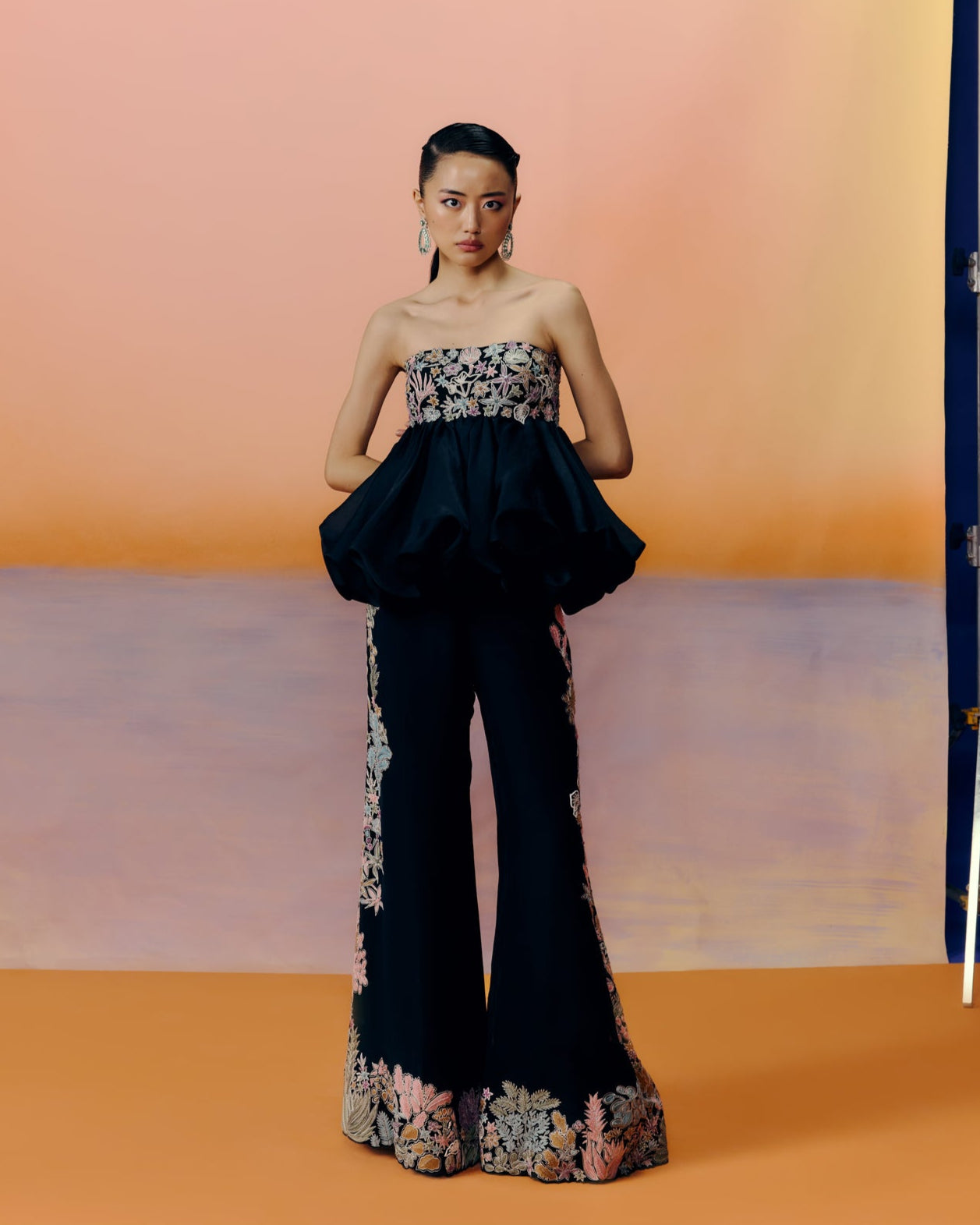 MULTICOLOUR WILDFLOWER APPLIQUE TOP WITH BUBBLE HEM AND MULTICOLOUR KALI LINES PANTS