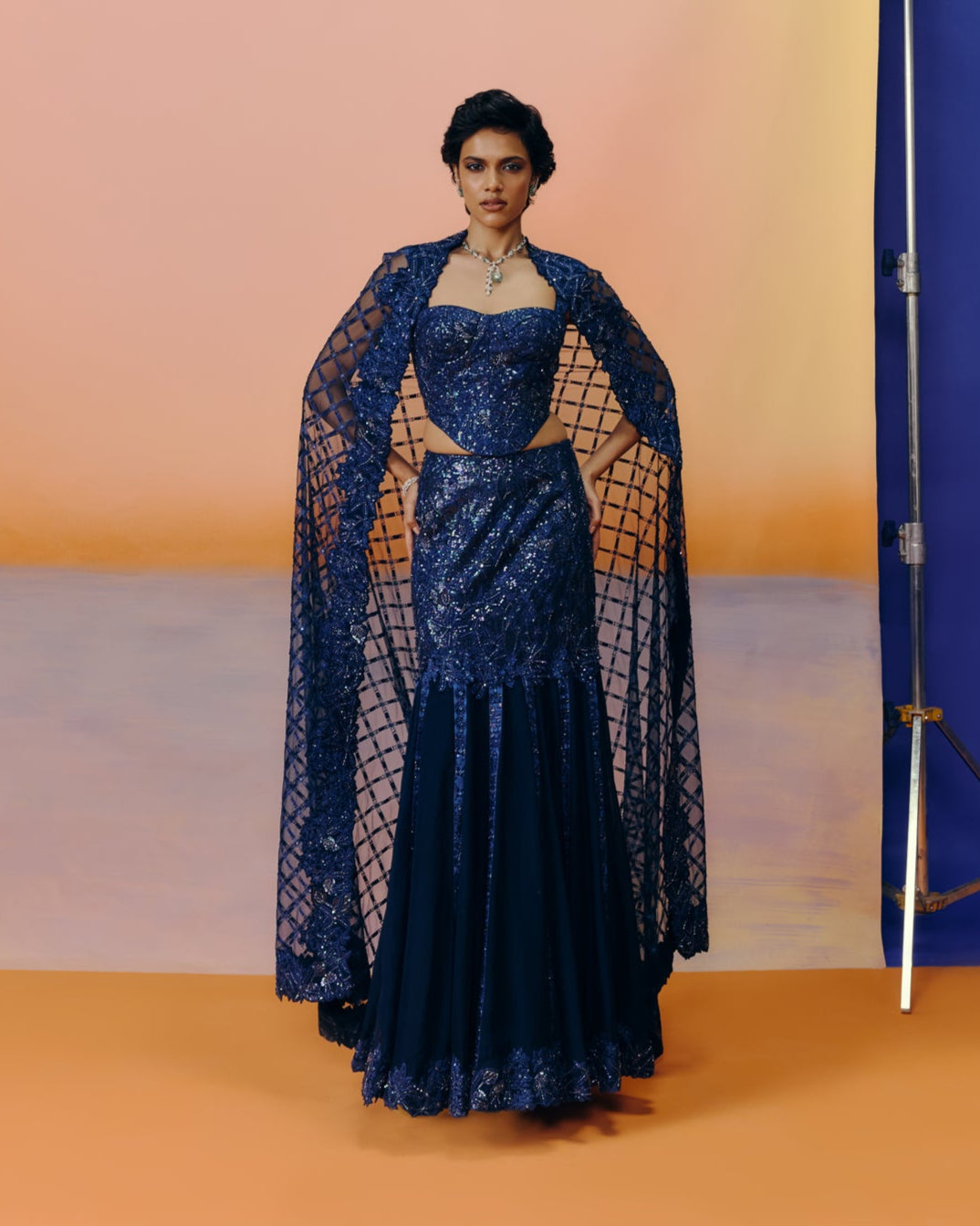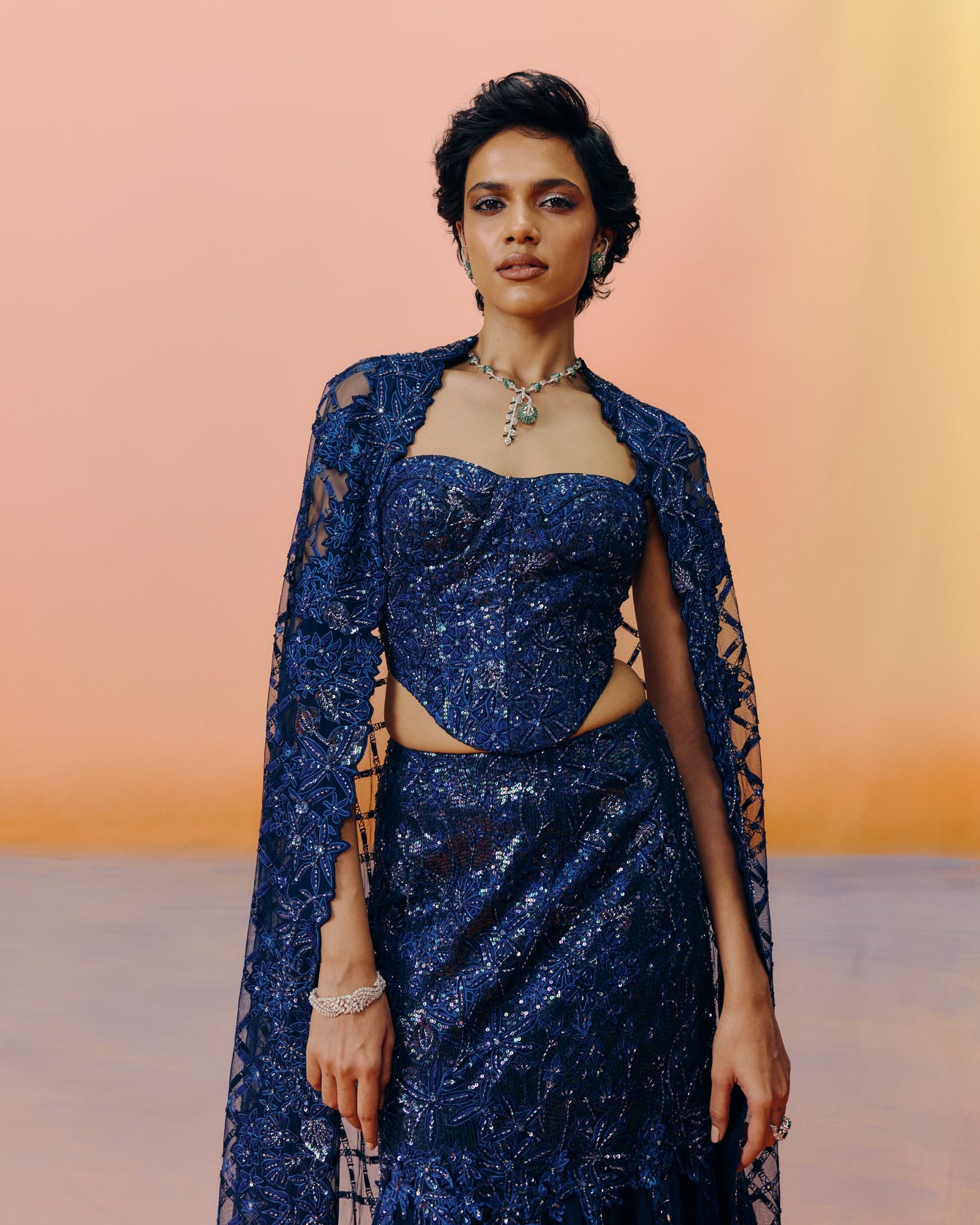 TONAL WILDFLOWER AND GEO LINES FIT AND FLARE SKIRT, WILDFLOWER CORSET AND GRID CAPE