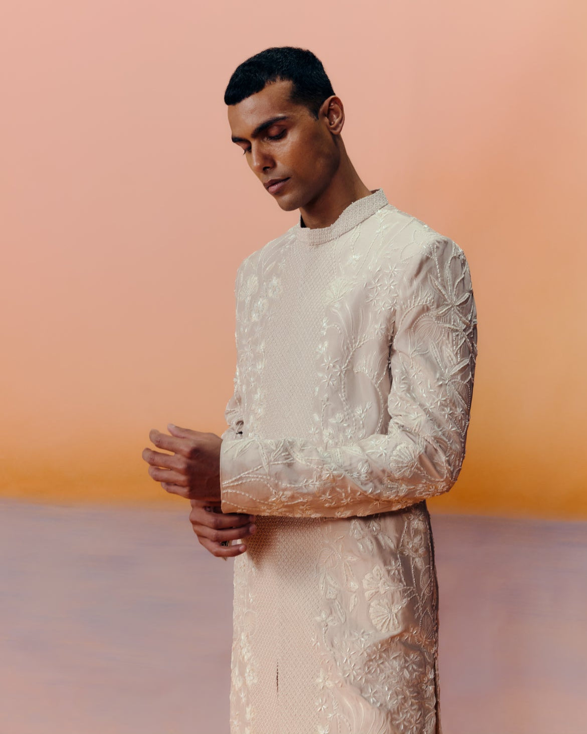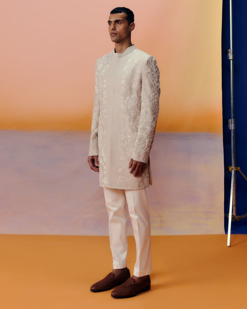 TONAL WILDFLOWERS EMBROIDERY AND ABSTRACT GEOMETRIC PATTERN PLACEMENT SHERWANI SET