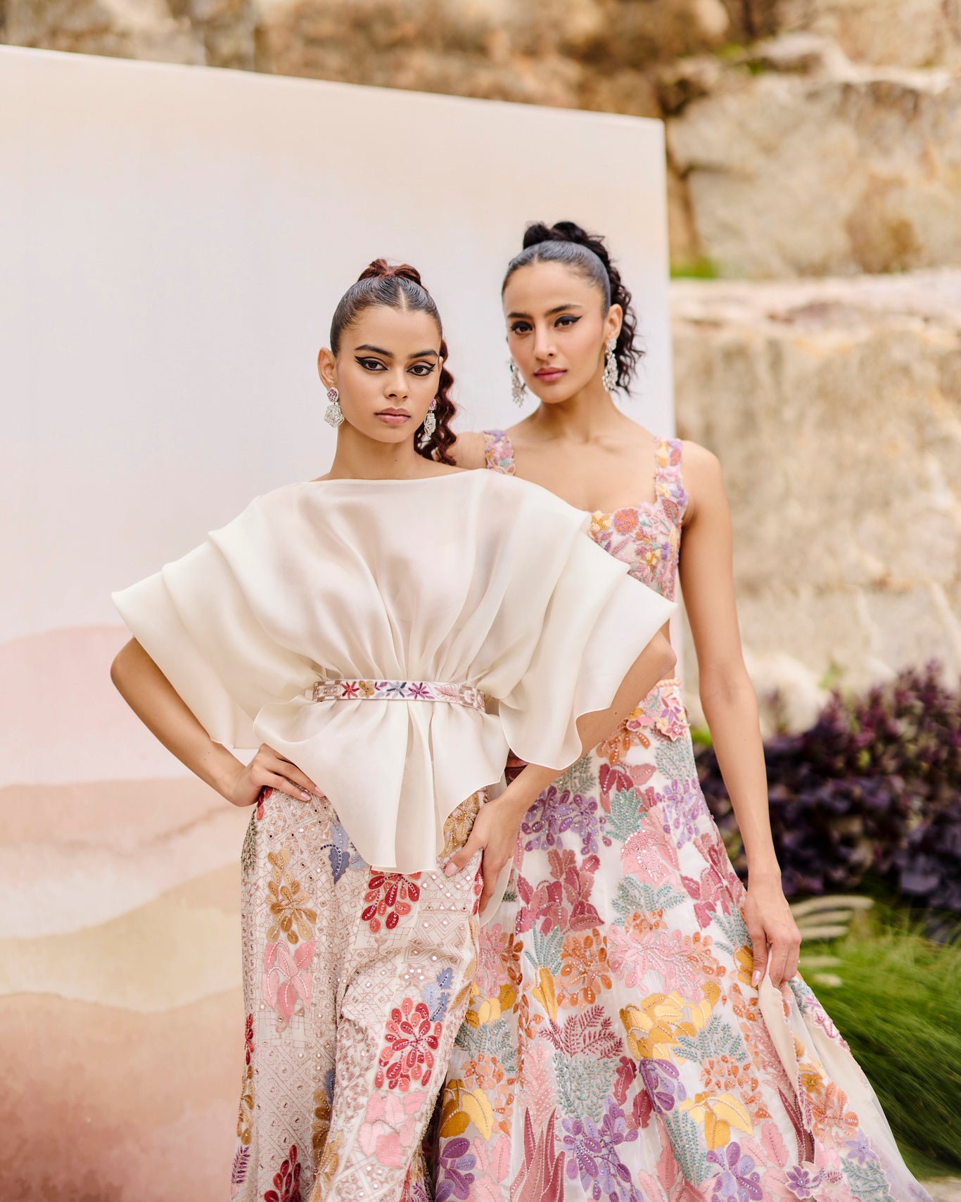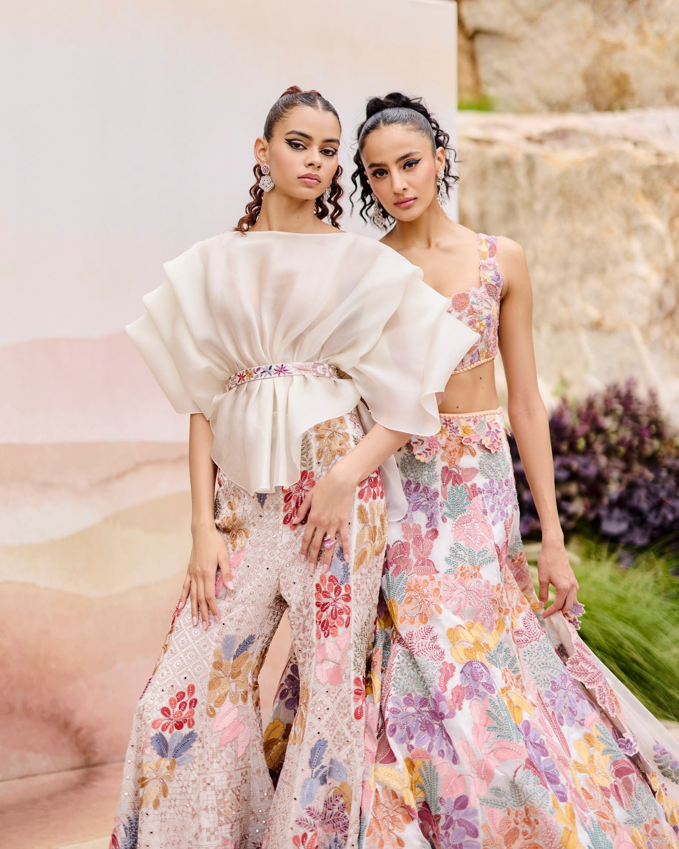MULTICOLOUR GEOMETRIC GRID AND APPLIQUE ASSORTED LEAVES PANT WITH POUF TOP
