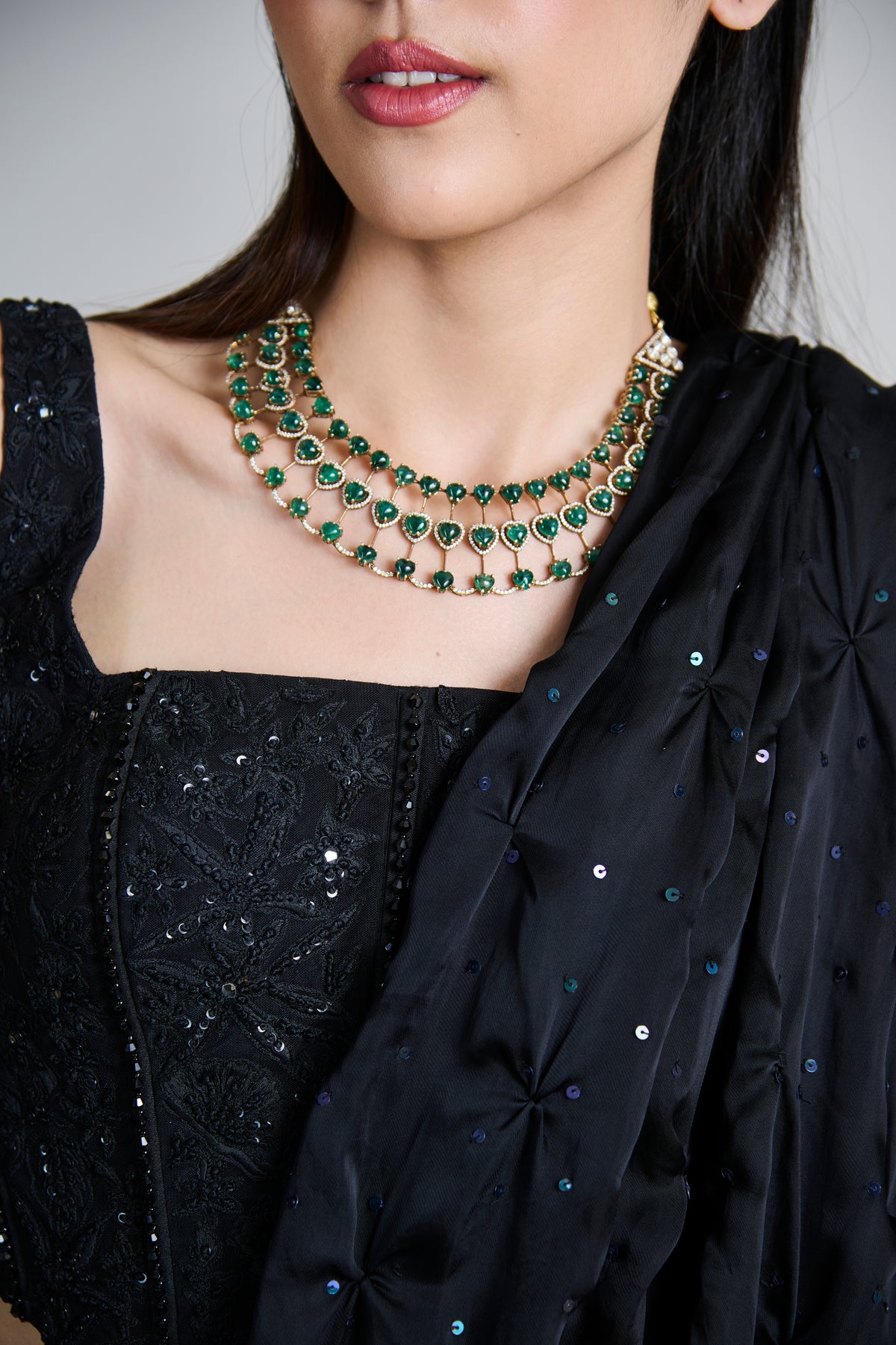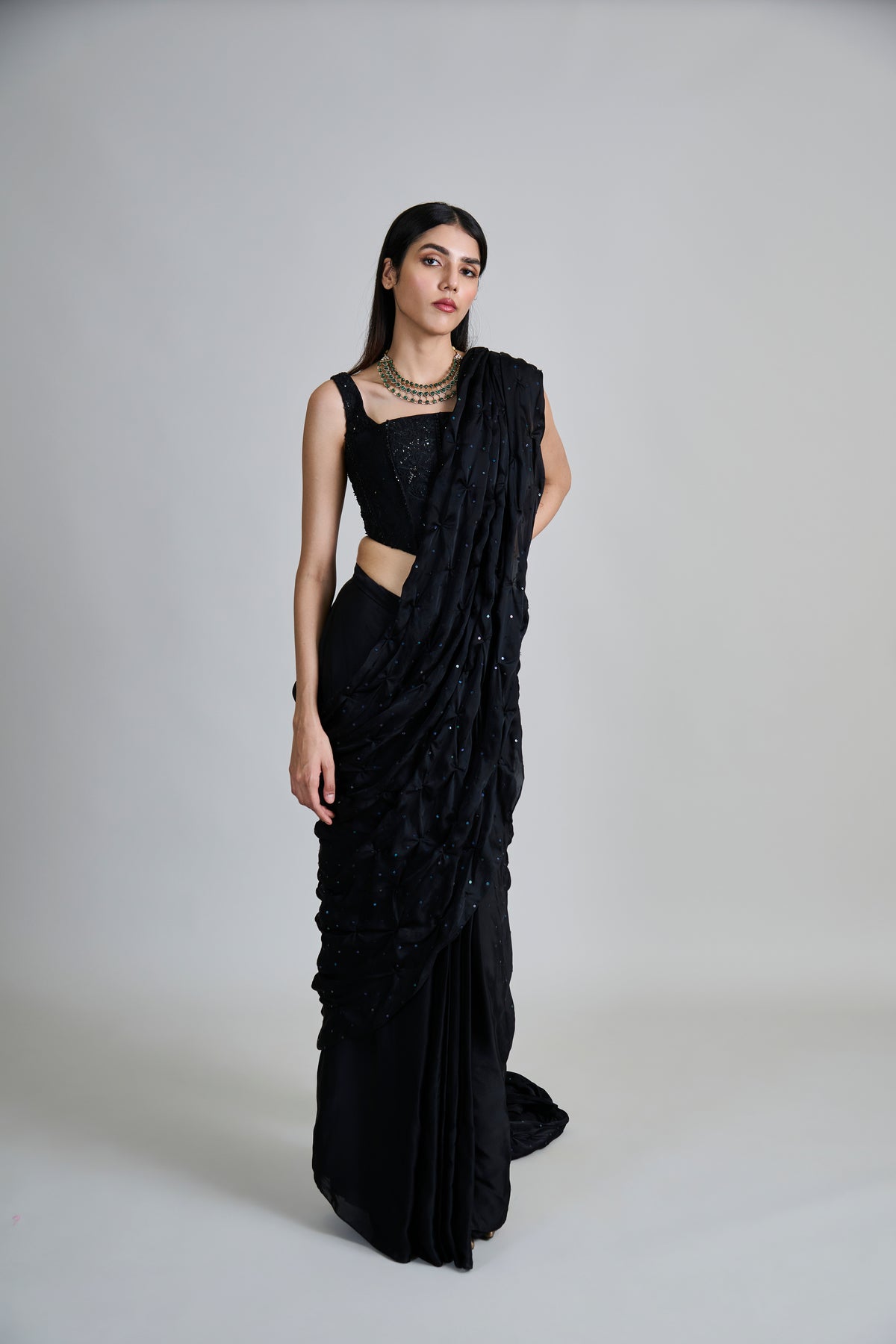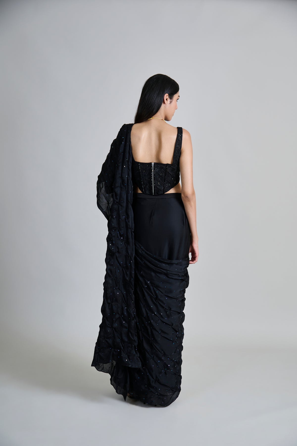 SMOCKED SAREE WITH SEQUINS PAIRED WITH A TONAL WILDFLOWER CORSET