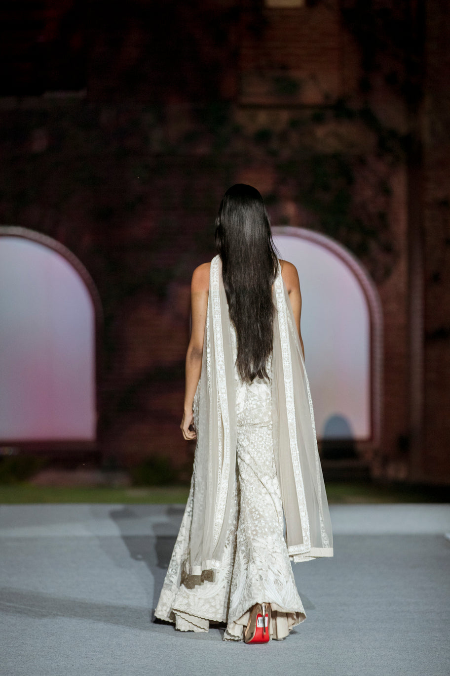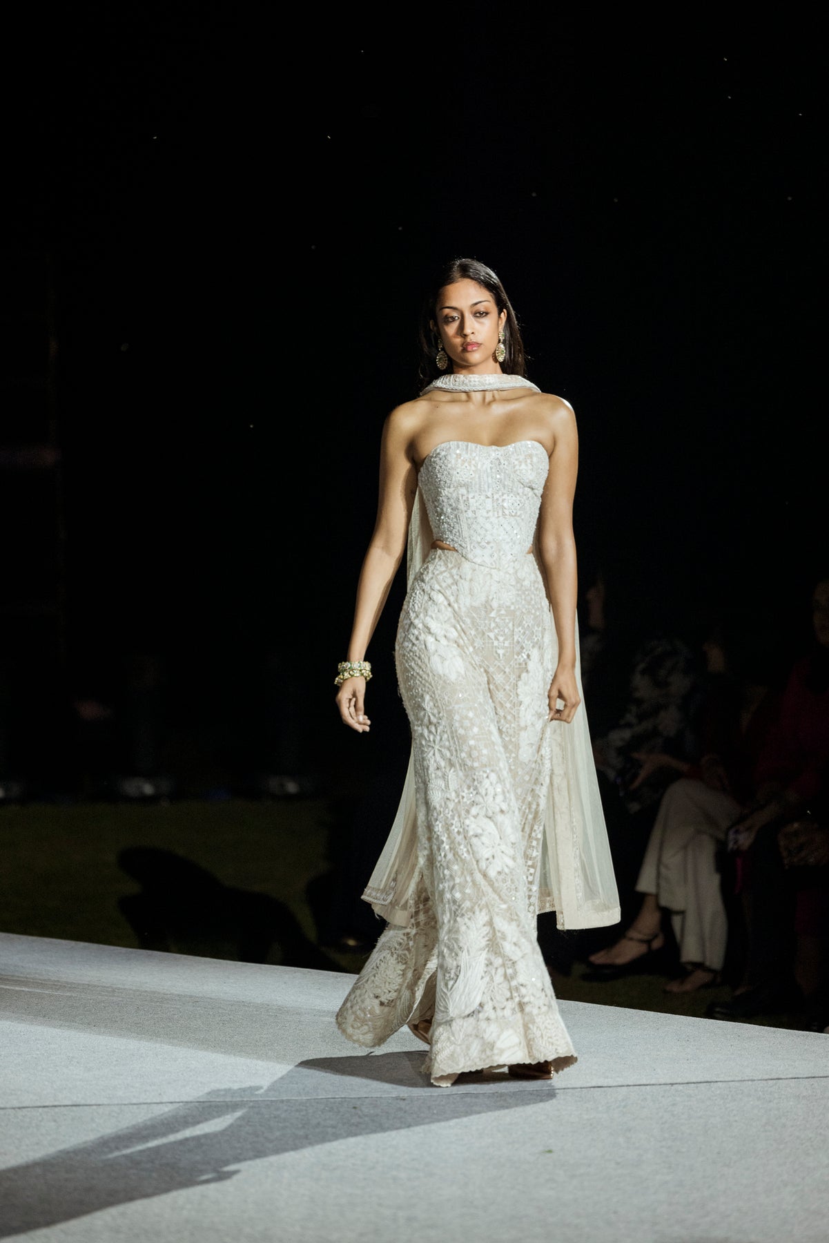 IVORY GEOMETRIC AMAYA PANTS WITH LEAVES BUNCH PLACEMENT, PAIRED WITH A GEOMETRIC CORSET AND DUPATTA