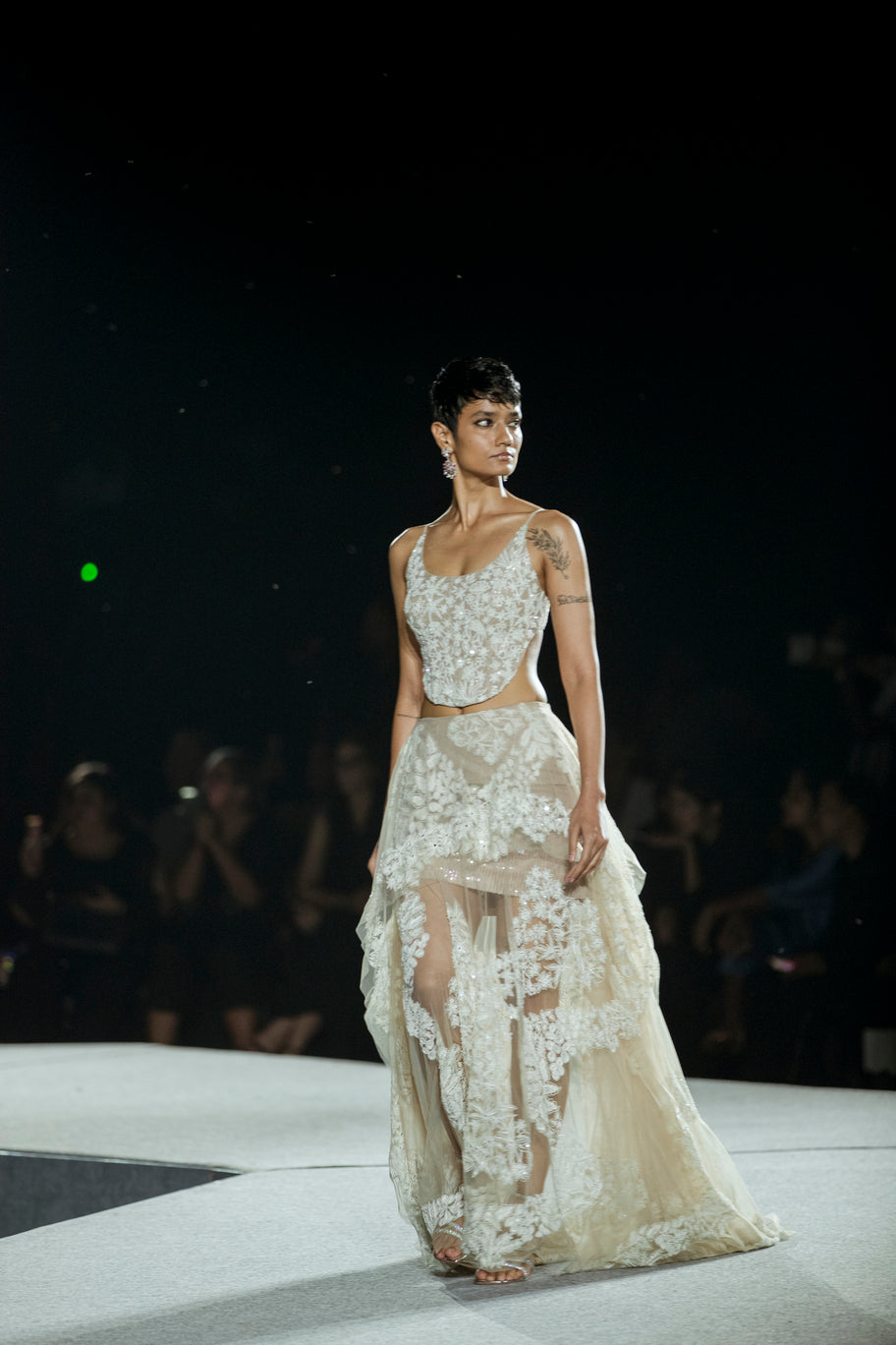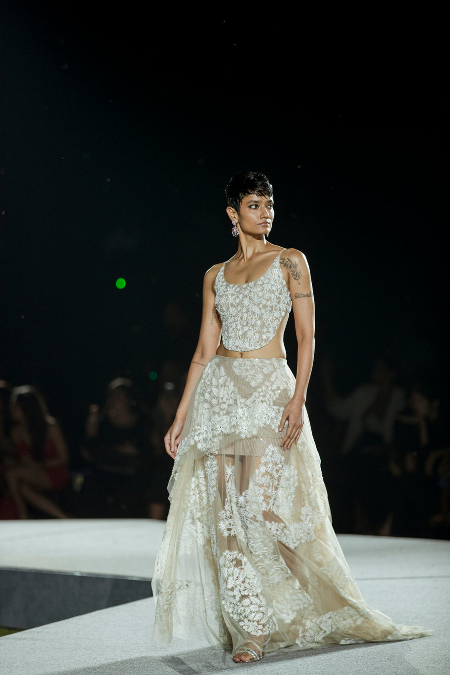 LAYOUT OVERLAY SKIRT WITH A SEQUIN INNER, PAIRED WITH AN IVORY WILDFLOWER CORSET ON A SEQUIN BASE