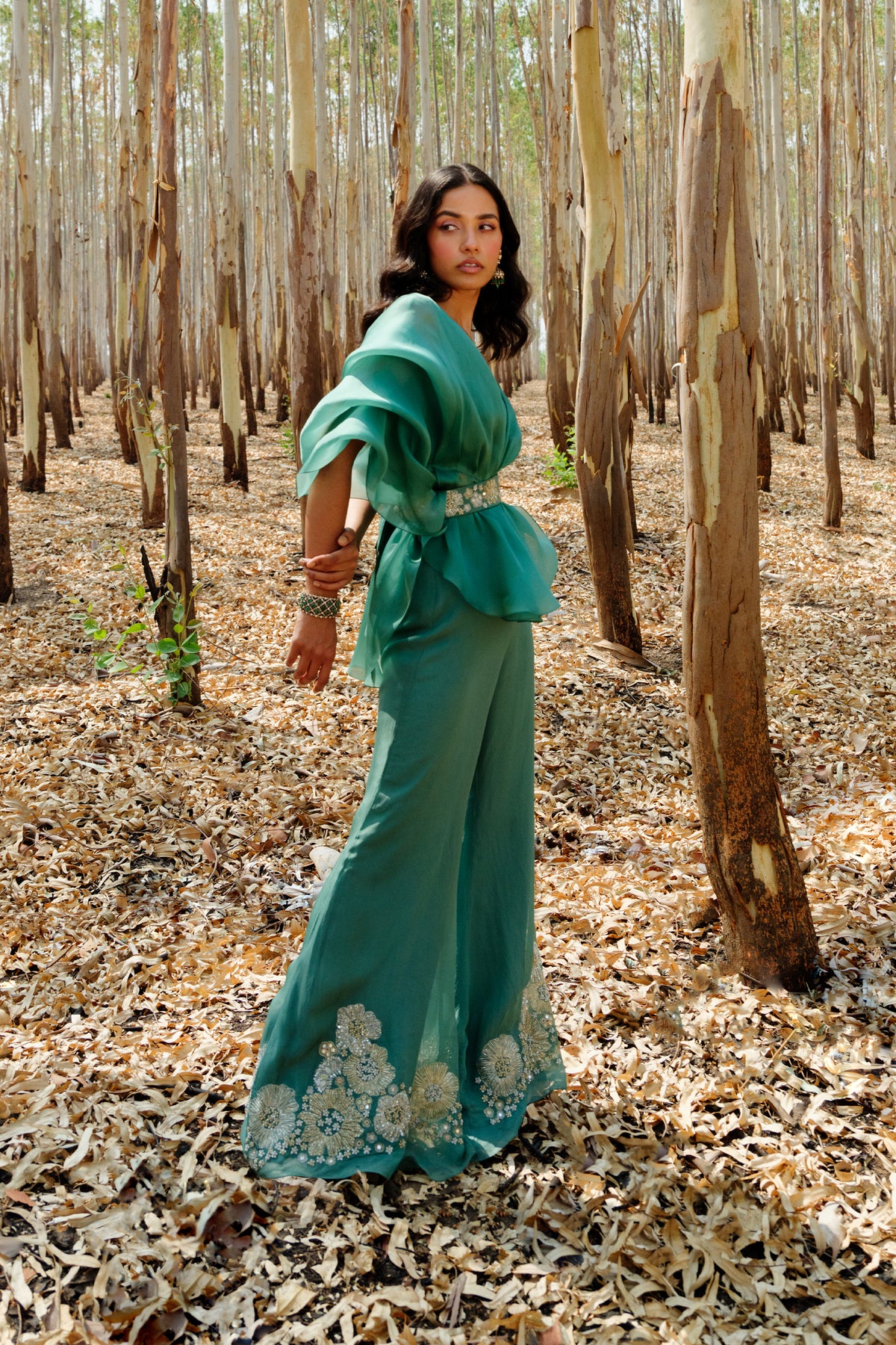 Teal organza pouf top with bustier and belt paired with floating border embroidered pants