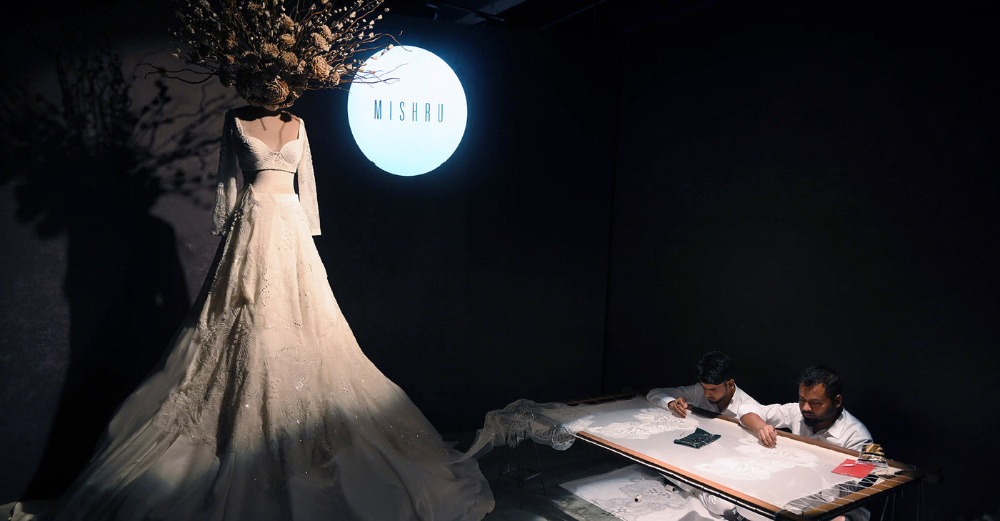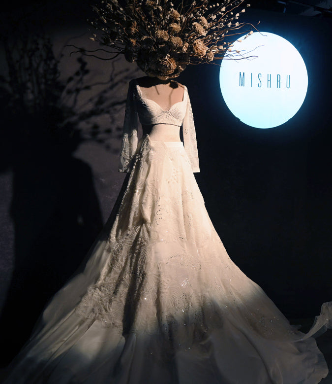 Mishru ensembles stand out because of the attempts of subtlety. The embroidery here is exceptionally detailed, typically in an unusual relief colour of off white pearls and glass beads; this compliments the brands sublime colour palette.