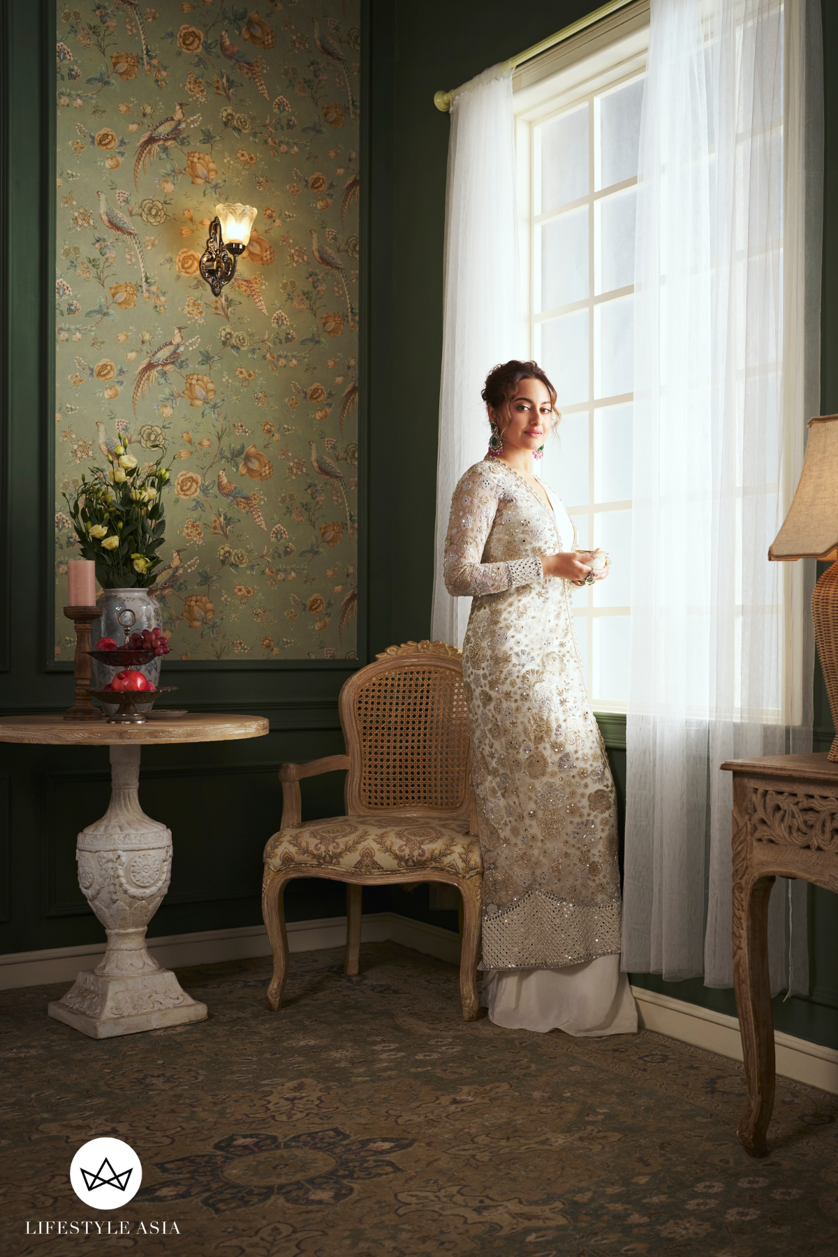 Long jacket paired with embroidered blouse along with a pre-draped saree and belt