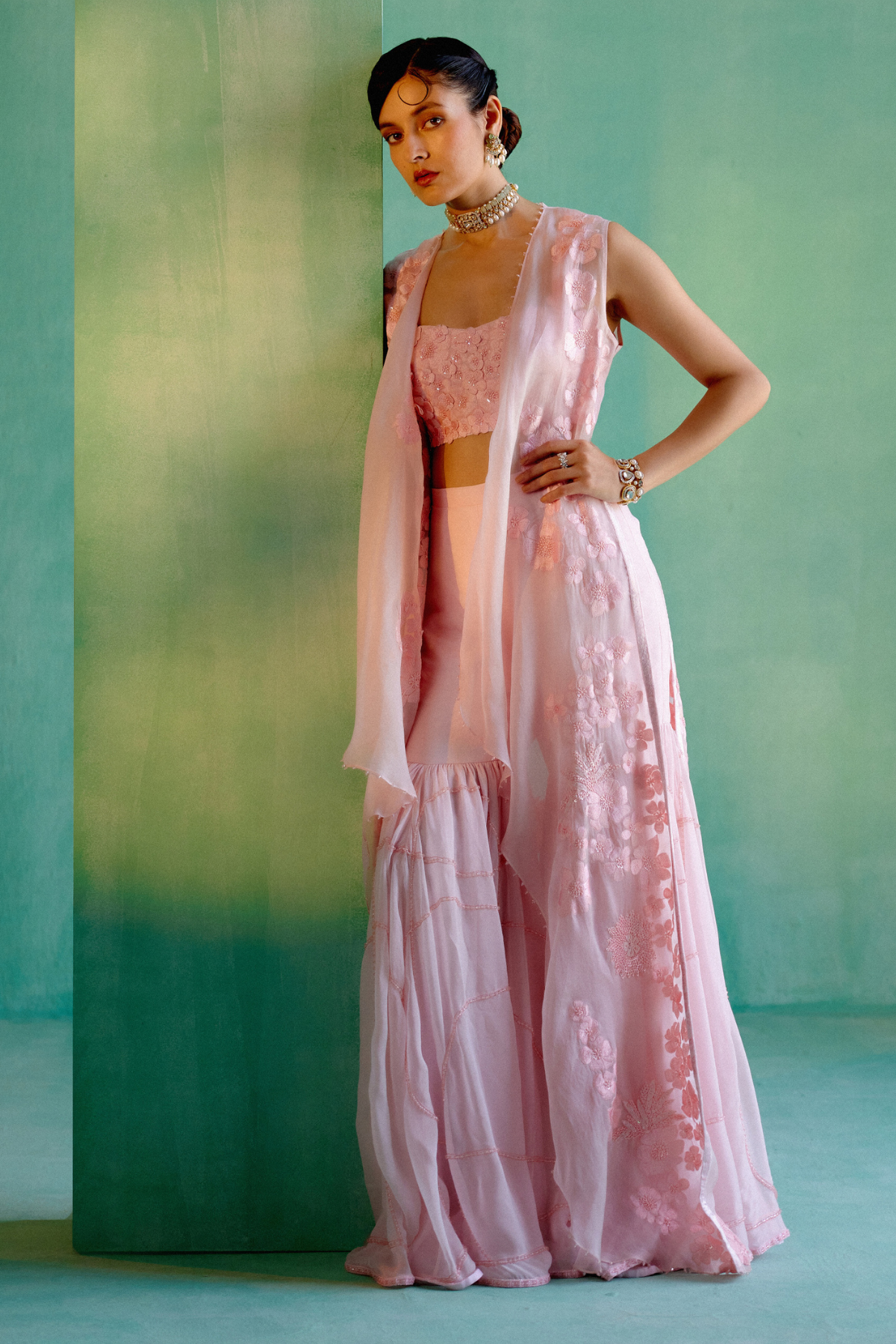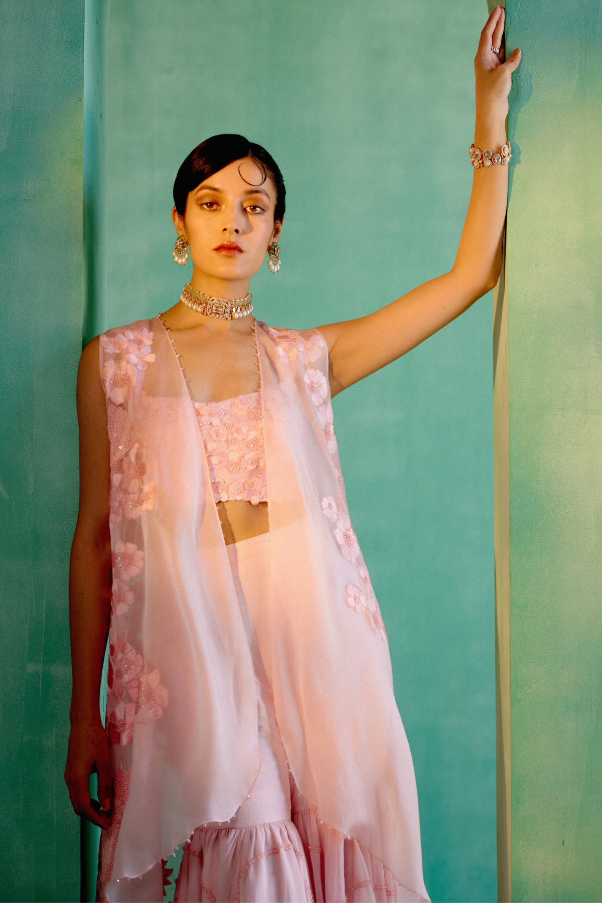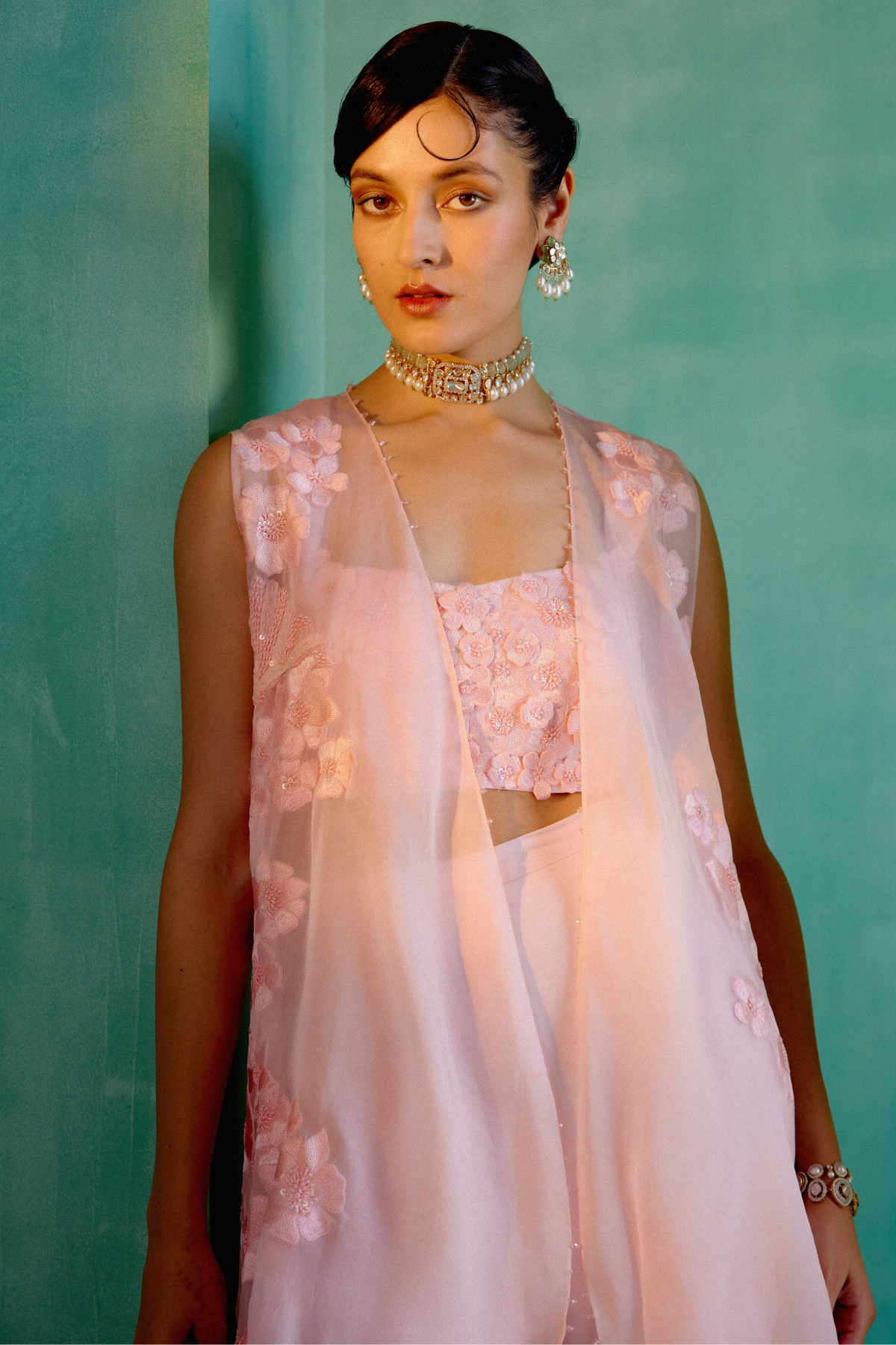 Velvet appliqué and encrusted embroidery jacket set with embroidered crop top and skirt