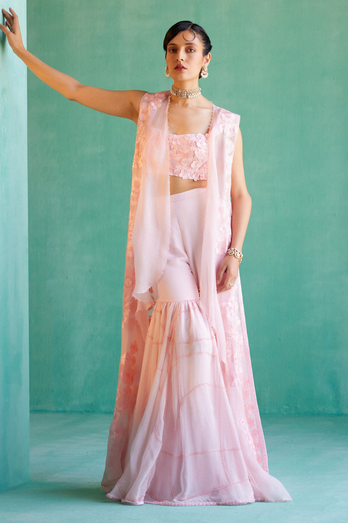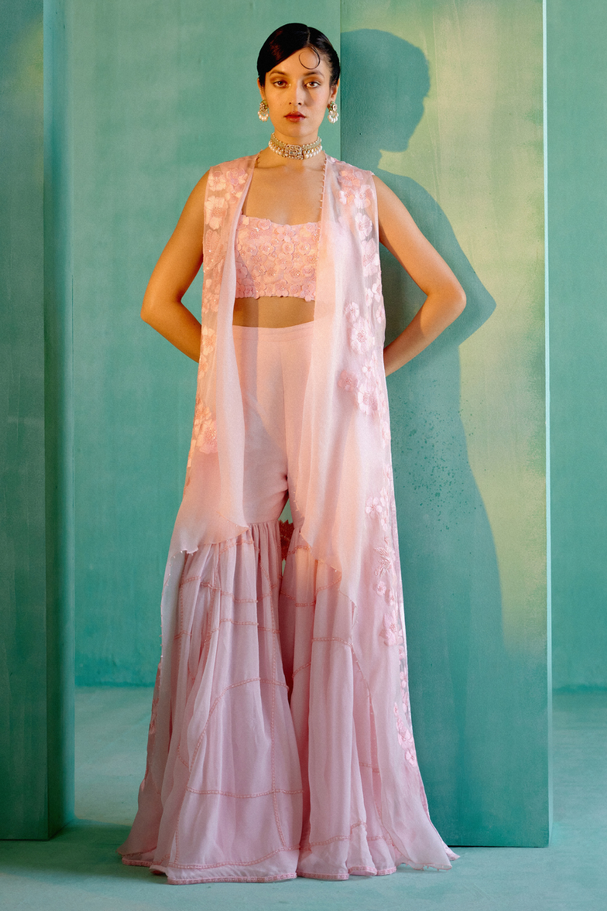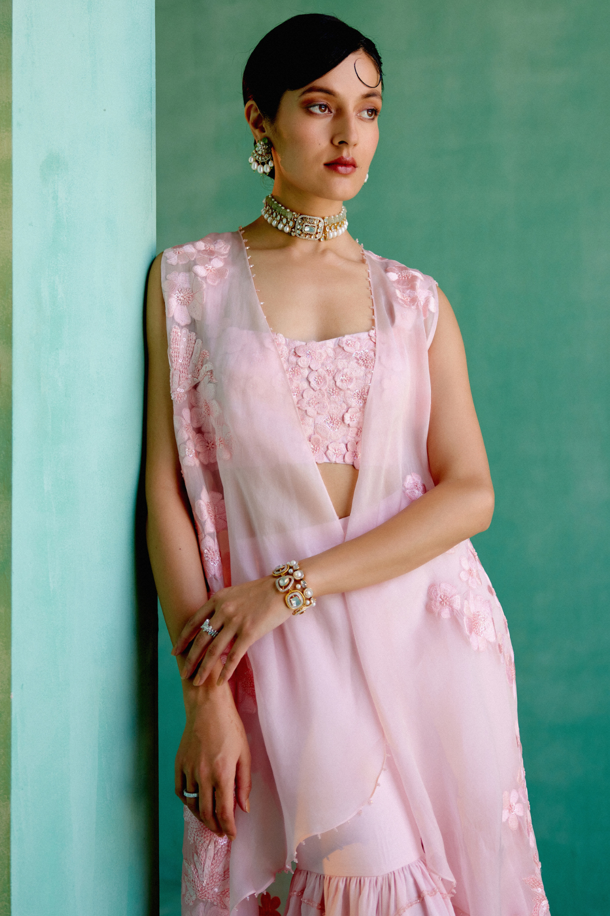 Velvet appliqué and encrusted embroidery jacket set with embroidered crop top and skirt
